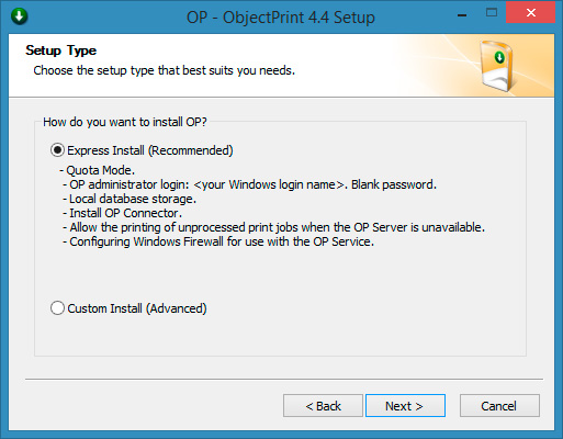 choose the 'Express Install' method, the OP administrator